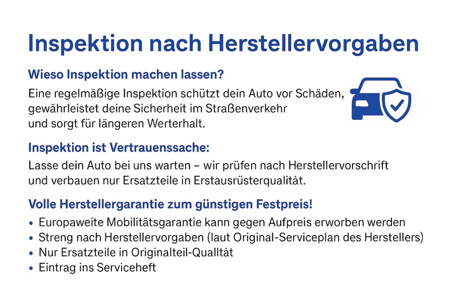 Die Herstellergarantie bleibt im vollen Umfang erhalten, da die Inspektion nach Herstellervorschrift erfolgt und ausschließlich Ersatzteile in Originalteilequalität verbaut
